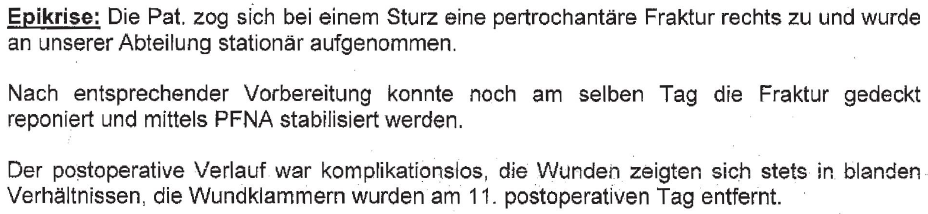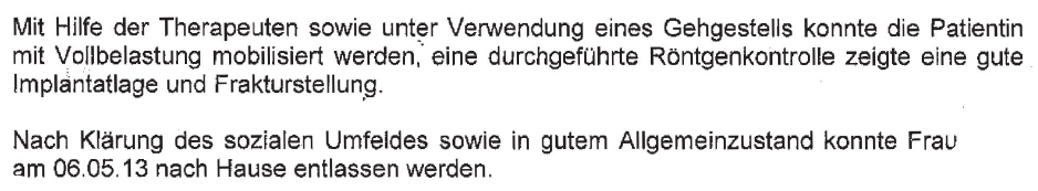 Aus dem Arztbrief des Prim. Univ.-Prof. DDr. B., Unfallabteilung des Landesklinikums Baden-Mödling, vom 06.05.2013 (Beilage 2/b) war die nachfolgend abgelichtete Schlussbetrachtung zur Oberschenkelknochenfraktur zu entnehmen:
