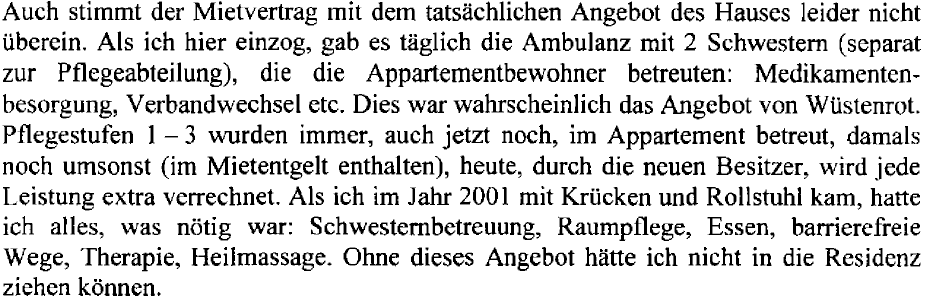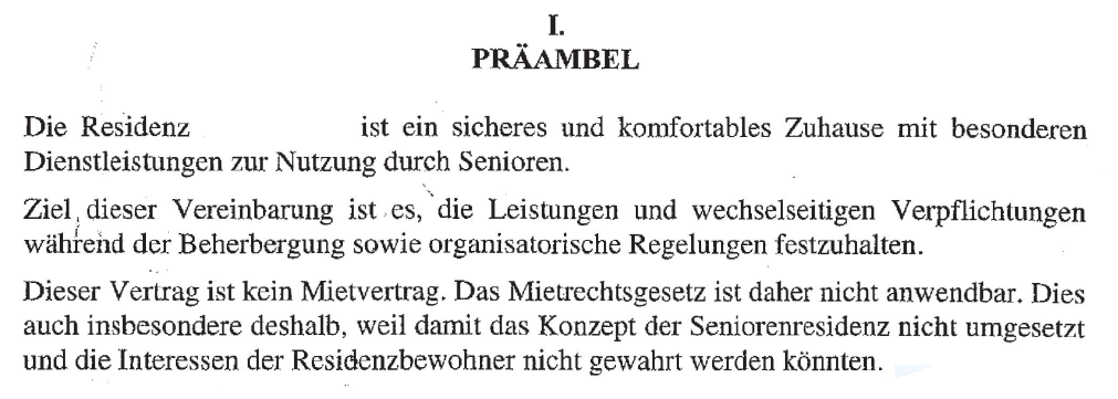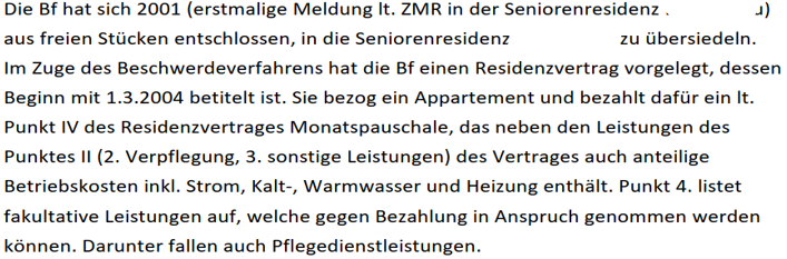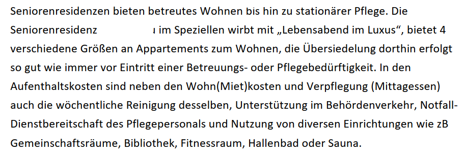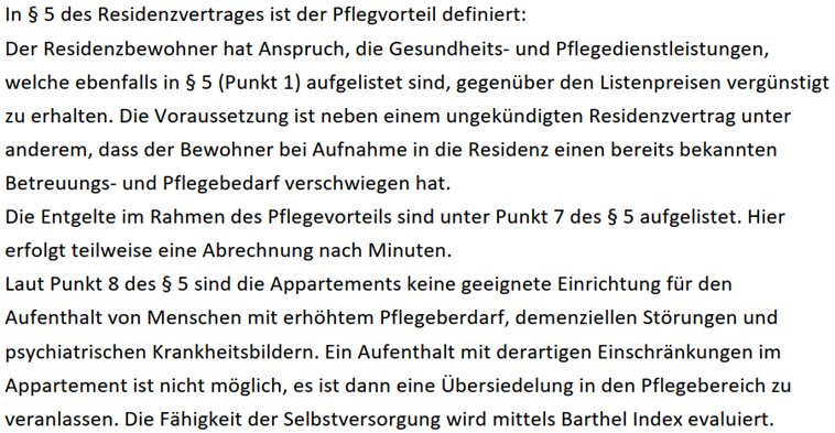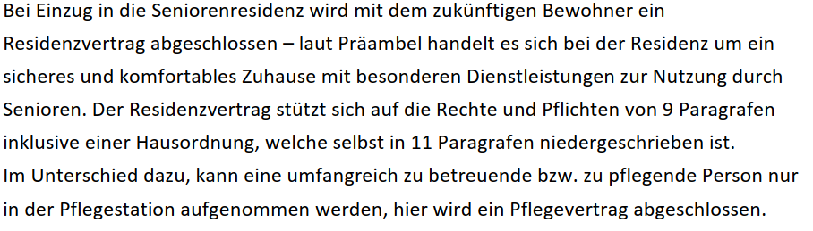 Mit den nachfolgenden Ablichtungen werden die Ausführungen der Amtsvertretung unter den Punkten "2.5. Residenzvertrag" und "2.6. Unterschied Seniorenresidenz-Pflegeheim" dargestellt: