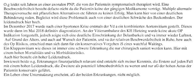 Die im Streitjahr diagnostizierte Herzklappenerkrankung verschafft Gewissheit über Atemnot der Residenzbewohnerin bei jeglichen Anstrengungen wie z.B. schon beim Stiegen steigen. Das im Gefolge des nach einer hyertonen Krise erstmals im Dezember 2017 an der Vitienambulanz des KH Hietzing festgestellte und im Mai 2018 definitiv diagnostizierte "kombinierte Aortenvitium" ist eine Krankheit mit deutlicher Einschränkung der Belastbarkeit der Patientin. Ein Klappenvitium ist nur chirurgisch sanierbar und bei der im Jahr 1929 geborenen Bf. mit einem hohen Mortalitäts- und vor allem Morbiditätsrisiko verbunden. Vor allem aufgrund des Operationsrisikos ist die Bf. im Streitjahr wunschgemäß konserativ im Sinn eines watchful Waitings (deutsch: "Beobachten und Abwarten") behandelt worden. "watchful waiting oder active surveillance" ist die Bezeichnung für eine spezielle Behandlungsstrategie in der Medizin, bei der die Krankheit zunächst nicht behandelt (Therapie), der Krankheitsverlauf aber in regelmäßigen Abständen kontrolliert (Diagnose) wird. Bei Erreichen bestimmter diagnostischer Parameter kann eine Therapie eingeleitet werden. Die Kontrollbesuche beim Internisten im Streitjahr sind durch einen Teilkostenersatz der BVA dokumentiert. Die Unterstützung des Internisten bei der Beobachtung der Bf. ist durch den Aufenthalt der Bf. in der SRBV im Jahr 2018 sichergestellt gewesen. Im Übrigen ist der Bf. im Gefolge einer Darmoperation im Jahr 2014 eine Diätverpflegung der Bf. empfohlen worden.