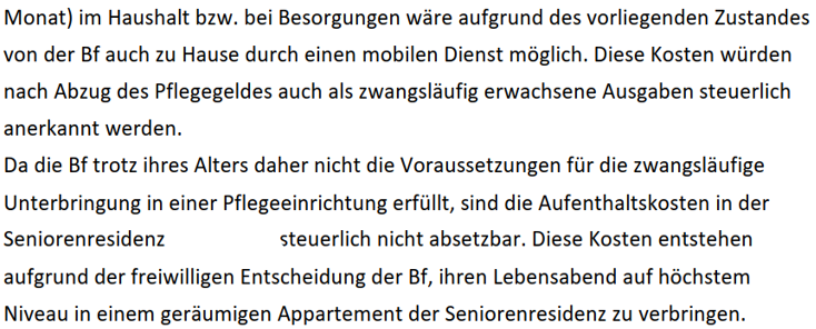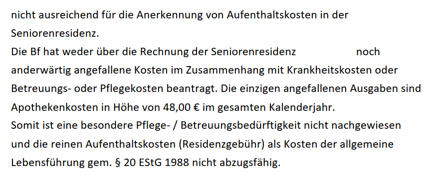 Die nachweislichen Leiden der Bf. an PNP, Harn- und Stuhlinkontinenz und kombinierten Aortenvitium im Streitjahr begründen keine Verpflichtung, Leistungsangebote betreffend Pflege und Betreuung in der SRBV anzunehmen. Die Tatsache, dass das Monatspauschale sich NUR aus Verpflegung und Unterkunftskosten zusammensetzt, keine Pflegekosten darin beinhaltet sind und die Bf. an auf das Streitjahr bezüglichen Kosten über die Residenzgebühr hinaus nur Apothekenkosten an die SRBV GmbH zu entrichten gehabt hat, ist somit für die Beurteilung des abgabenrechtlichen Charakters der in Rede stehenden Appartementkosten für das Streitjahr nicht wesentlich.