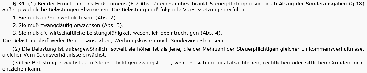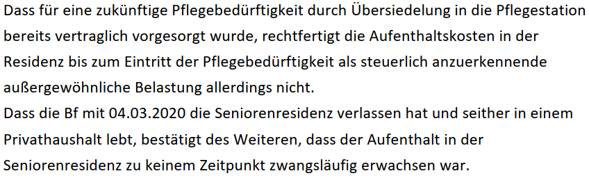 Nach Jakom/Peyerl, EStG 2020, 13. Aufl. 2020, § 34, Rz 90, und der dort zitierten Rechtsprechung des Verwaltungsgerichtshofs und des Unabhängigen Finanzsenats sind Kosten für ein Altersheim (Pflegeheim) dann keine außergewöhnliche Belastung, wenn eine Unterbringung aus Altersgründen erfolgt. Anders, wenn besondere Aufwendungen abzudecken sind, die durch Krankheit, Pflege- oder Betreuungsbedürftigkeit verursacht sind (VwGH 27.05.2003, 97/14/0102, VwGH 16.12.1987, 86/13/0084; 97/14/0102; LStR 887; es genügt, wenn jemand behinderungsbedingt nicht mehr in der Lage ist, den Haushalt selbst zu führen, VwGH 30.06.2010, 2008/13/0145). Hievon kann bei Vorliegen einer ärztlichen Bescheinigung bzw. - nach der Praxis der Finanzverwaltung - bei Anspruch auf Pflegegeld ausgegangen werden (kein Selbstbehalt, Abs. 6 TS 6; der tatsächliche Bezug von Pflegegeld bildet aber keine rechtliche Voraussetzung, VwGH 26.05.2010, 2007/13/0051; UFS 25.10.2012, RV/2986-W/12 Appartement). Abzugsfähig sind dann auch die Kosten der Übersiedlung in ein Alters- bzw. Pflegeheim wegen Pflegebedürftigkeit (WGW/Wanke § 34 Rz.78 "Umzugskosten").