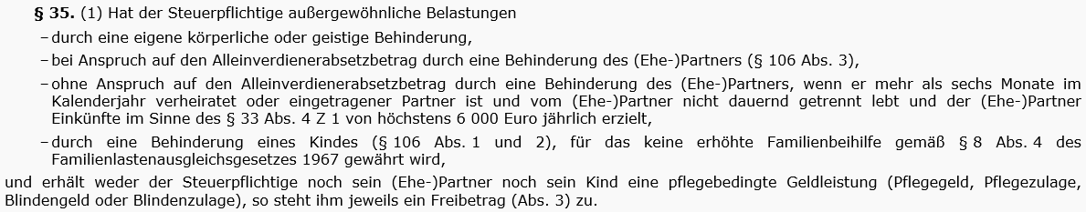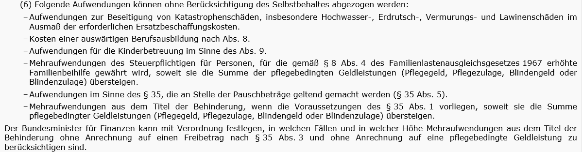 Rz 887). Übersteigen die Heim- oder Pflegekosten die Summe der pflegebedingten Geldleistungen (Pflegegeld, Pflegezulage, Blindengeld oder Blindenzulage), können diese Mehraufwendungen aus dem Titel der Behinderung (wenn die Voraussetzungen des § 35 Abs. 1 vorliegen) ohne Kürzung um den Selbstbehalt nach § 34 Abs. 4 EStG 1988 abgezogen werden (§ 34 Abs 6 sechster Teilstrich; vgl § 34 Tz 46).