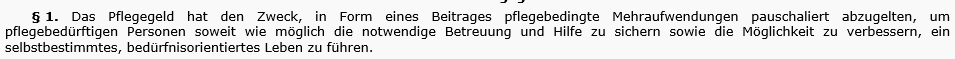 Das Bundespflegegeldgesetz (BPGG) unterstützt seit 1993 in Form eines pauschalierten Beitrages Menschen, die auf Hilfe und Betreuung durch andere angewiesen sind. Seitens des Gesetzgebers wurde der Zweck des Pflegegeldes im nachfolgend abgelichteten § 1 BPGG BGBl. Nr. 110/1993 zuletzt geändert durch BGBl. I Nr. 58/2011, wie folgt bestimmt: