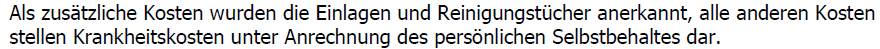 Hinsichtlich der Kosten Kz. 476 anerkannte das Finanzamt die Einlagen und Reinigungstücher als zusätzliche Kosten und stellte bezüglich all den anderen Kosten fest, dass diese Ausgaben Krankheitskosten unter Anrechnung des persönlichen Selbstbehaltes darstellen würden und daher dadurch, dass sie niedriger als der für die Bf. gültige Selbstbehalt in Höhe von 5.165,96 € seien, nicht berücksichtigt würden.