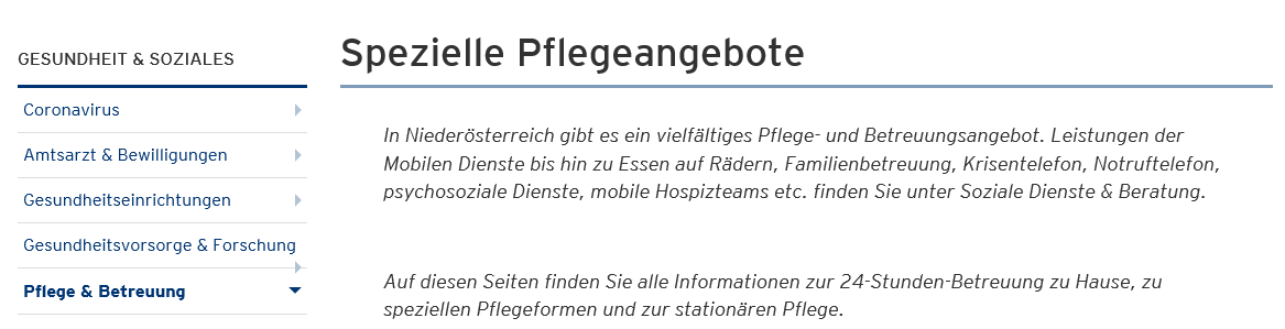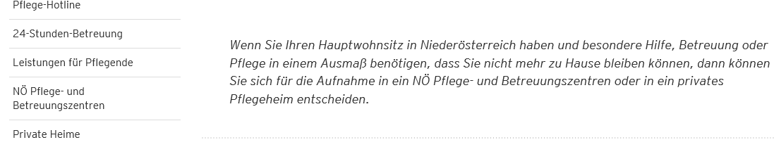 Wenn Heimappartements an Beziehern von Pflegegeld der z.B. Stufe 1 angeboten werden, ist den Anboten der Geschäftsführung von Seniorenresidenzen und Pflegeheimen gemein, dass diese Häuser nach Perfektion auf allen Ebenen streben und den Beziehern von Pflegegeld den Heimaufenthalt so angenehm wie möglich gestalten wollen. Jeder Pflegegeld z.B. der Stufe 1 beziehende Bewohner von einem Altersheim wohnt bei entsprechenden Angebot in der Regel unabhängig davon, ob das Heim vom Staat oder einer Kapitalgesellschaft geführt wird, in seinem eigenen Appartement und bekommt nach Bedarf die Unterstützung, die er braucht, ist ins soziale Leben integriert und hat trotzdem einen Rückzugsbereich. Wird Behinderten der Pflegegeldstufe 1 die Aufnahme in ein NÖ Pflege- und Betreuungszentrum verwehrt, so verschafft die nachfolgend abgelichtete Website auf https:// www. noe.gv.at/noe/Pflege/ Adressenliste_Pflege_ Betr.zentren_ Bezirke. Html Gewissheit über die Zwangsläufigkeit von Appartementkosten für jene Behinderte mit der Pflegegeldstufe 1, die behinderungsbedingt nicht in der Lage sind, den Haushalt selbst zu führen, und daher auf eine Betreuung, wie sie in einem Alters- oder Pflegeheim typisch ist, angewiesen sind: