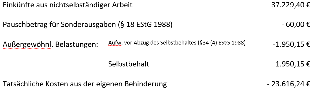 Die Aufwendungen für außergewöhnliche Belastungen sind dadurch, dass sie niedriger als der für die Bf. gültige Selbstbehalt in Höhe von 1.975,81 € sind, nicht berücksichtigt worden. Über die unter "Tatsächliche Kosten aufgrund einer Behinderung" beantragten Beträge von 23.616,24 € hinaus sind keine weiteren Kosten abziehbar gewesen.
