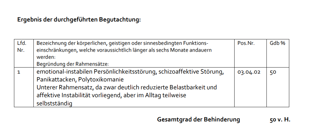 1 | Emotional-instabilen Persönlichkeitsstörung, schizoaffektive Störung, Panikattacken, Polytoxikomanie-Substitutionsprogramm Unterer Rahmensatz, da zwar deutlich reduzierte Belastbarkeit und affektive Instabilität beschrieben, aber im Alltag teilweise selbständig | 03.04.02 | 50 |