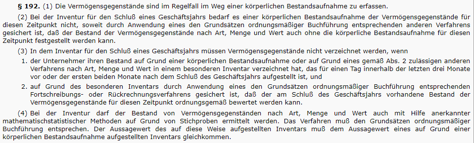 Die Bf. ist eine GmbH und somit eine Kapitalgesellschaft, die § 189 Z 1 UGB zufolge unabhängig vom Umsatz rechnungslegungspflichtig ist und den Gewinn gemäß § 5 EStG 1988 zu ermitteln hat. Jedes rechnungslegungspflichtige Unternehmen ist gemäß § 191 UGB dazu verpflichtet, ein Inventar, also ein genaues Verzeichnis der der Firma gewidmeten Vermögensgegenstände und Schulden mit jeweils Wertangabe, zum Beginn des Unternehmens und darüber hinaus für den Schluss eines jeden Geschäftsjahrs aufzustellen. Die Verfahrensvorschriften, die darüber bestimmen, wie ein Inventurverfahren durchzuführen ist, sind dem nachfolgend abgelichteten § 192 UGB zu entnehmen: