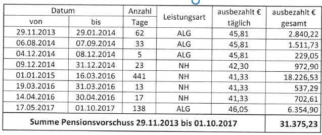 Wie auf Seite 4 dieser Anlage /C ersichtlich, wurde diese Berechnung eines virtuellen Bezuges im Gesamtbruttobetrag von € 100 238,80 von der PVA für den gesamten Nachverrechnungszeitraum von 01 11 2013 bis 31 10 2017 ausschließlich zur Ermittlung der für diesen Zeitraum noch 2017 von der PVA