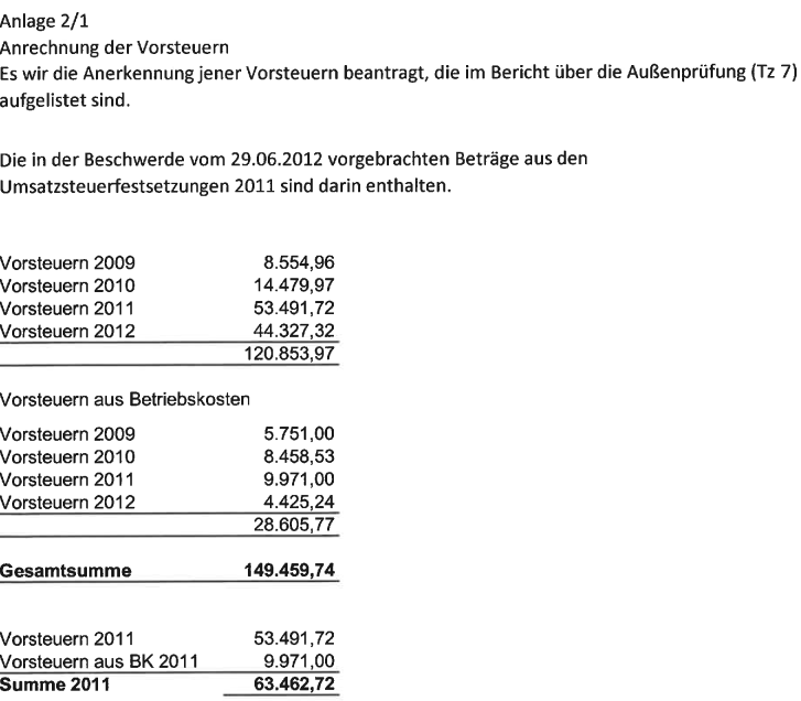 Am 30.4.2012 wurden Bescheide über die Festsetzung von Umsatzsteuern für die Zeiträume 5-6/2011 und 8-12/2012 erlassen, die folgende Nachforderungen ergaben: