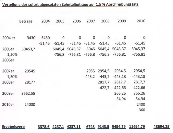 Verteilung der sofort abgesetzten Zehntelbeträge auf 1,5% Abschreibungssatz