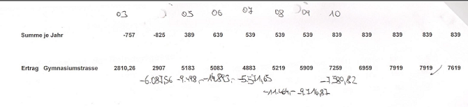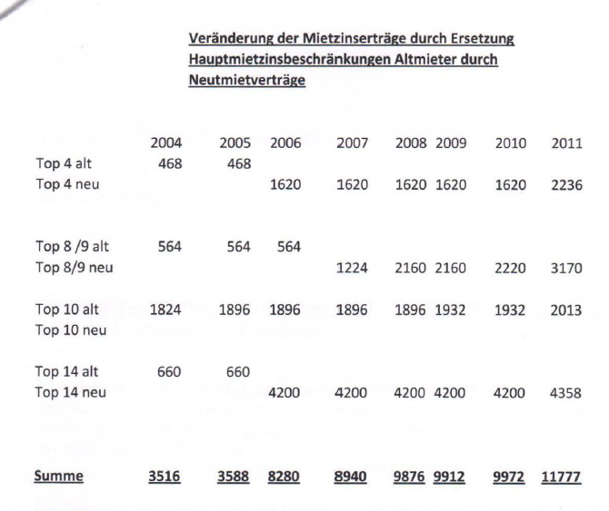 Seit dem Ankauf konnte bei den Wohnungen durch Ausmietung der Altmieter mit mietrechtlichen Beschränkungen und Vermietung der bisherigen Hausmeisterwohnung eine wesentliche Ertragssteigerung erzielt werden. Siehe beiliegende Aufstellung von z.B rd 3.500 € Altmieterträge im Jahr 2004 konnte bis 2011 eine Erhöhung der Nettomieteinnahmen auf rd 11 .800 € erreicht werden.