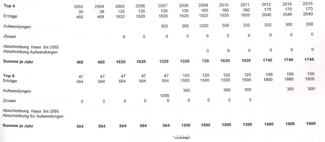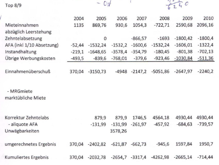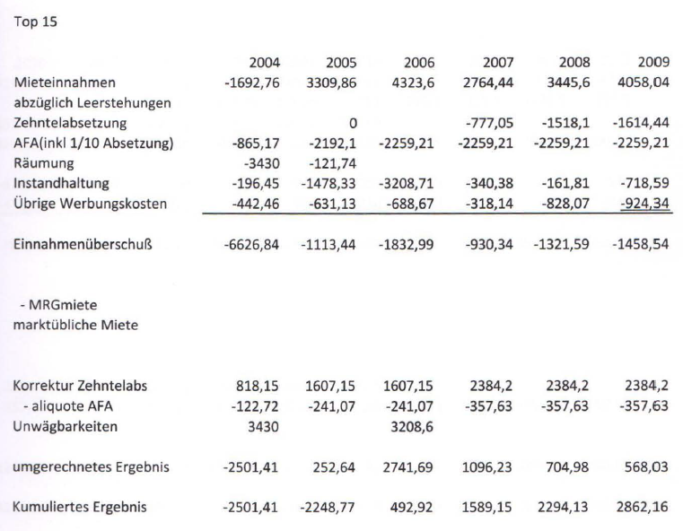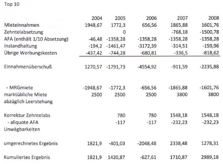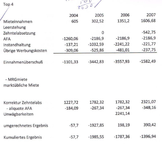 Die positiven Annahmen betreffend Mieteinnahmen sind in der Zwischenzeit auch eingetreten, da eine Einnahmenverbesserung vom Top 4 zB von 468 € für die Zeiträume 2004 bis 2006 auf 1.620 ab Jahr 2006 bzw dann ab 2011 auf 2.236 €.