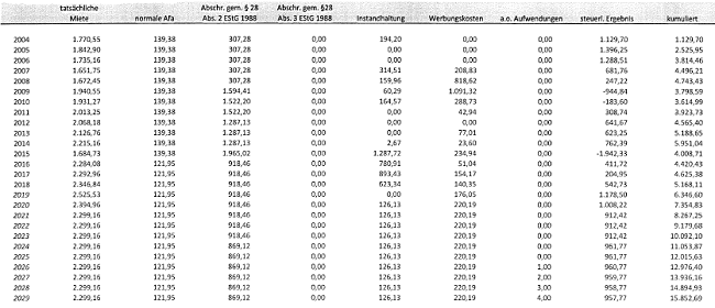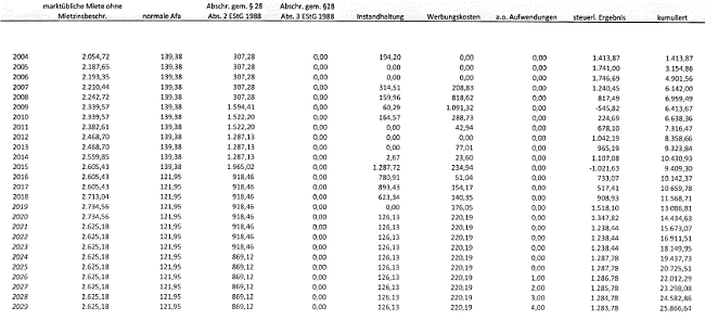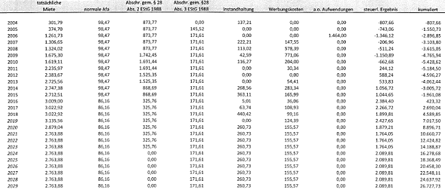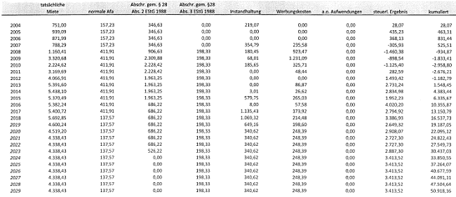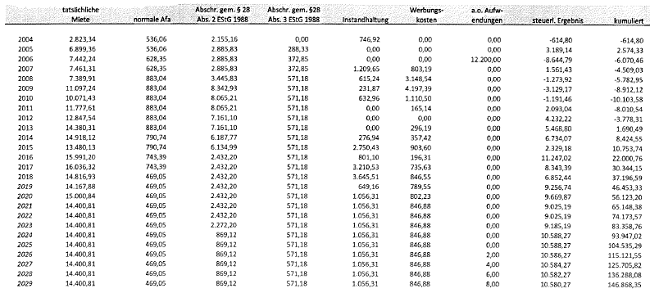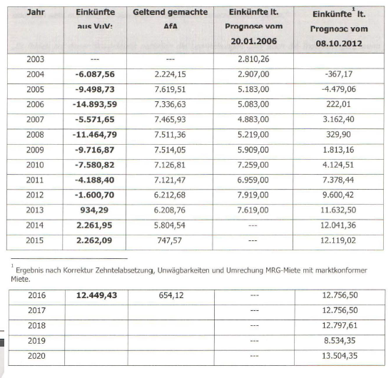 Tatsächlich wurde aus der Vermietung ein negativer Überschuss von € -64.814,01 erzielt. Demgegenüber sollte nach der Prognoserechnung im selben Zeitraum 2004 bis 2010 ein Überschuss von € 36.443 erzielt werden. Diese eklatante Differenz zwischen dem prognostizierten und dem tatsächlich erzielten Ergebnis ist zunächst auf stark voneinander abweichende Ansätze bei den Abschreibungen (z.B. 2005 € 961,- lt. Prognose gegenüber erklärten € 6.465,56) zurückzuführen.