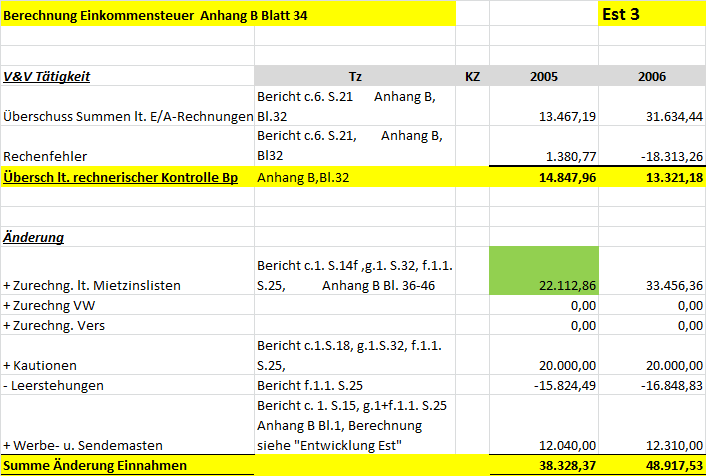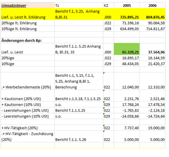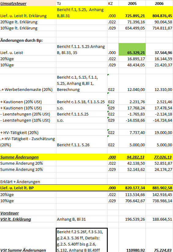 Die Darstellung der Schätzung findet sich für Umsatzsteuer im Bp-Bericht unter „F", für die Einkommensteuer unter „G", die entsprechenden Berechnungen im Anhang Bp-Bericht betr. Umsätzen „ad.f.", betreffend Einkommensteuer „ad.g.".