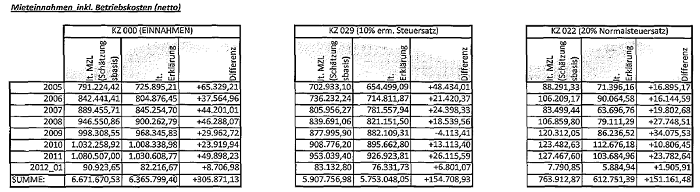 - Die Mieteinnahmen wurden vom FA anhand der vorgelegten Mietzinslisten hochgerechnet (Berechnungen der Bp je Objekt siehe im Anhang z. Bp-Bericht) und die daraus resultierenden Differenzbeträge zu den erklärten Umsätzen hinzugerechnet, unter Berücksichtigung einer 2% Leerstehung und zusätzlicher dauerhafter Leerstehungen lt. Zinsliste.