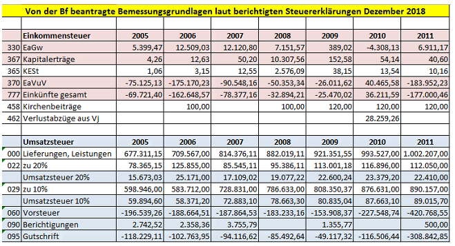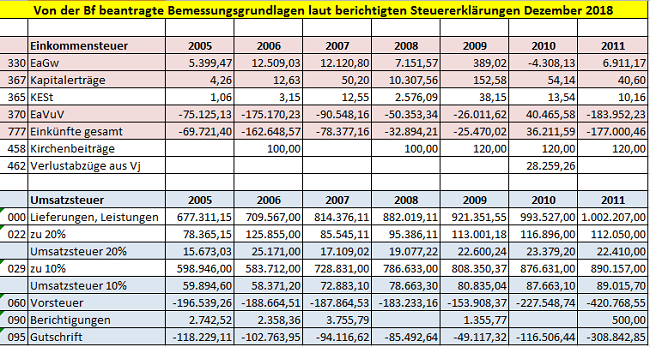 Die in den Steuererklärungen vom 26. 12. 2018 erklärten Bemessungsgrundlagen wurden gemäß Geldflussrechnung des BFG korrigiert und den beigeschlossenen Berechnungsblättern hinsichtlich Umsatzsteuer für die Jahre 2005 bis 2007 und Einkommensteuer für die Jahre 2006 bis 2007 (Einkommensteuer 2005: ersatzlose Aufhebung) zugrunde gelegt.