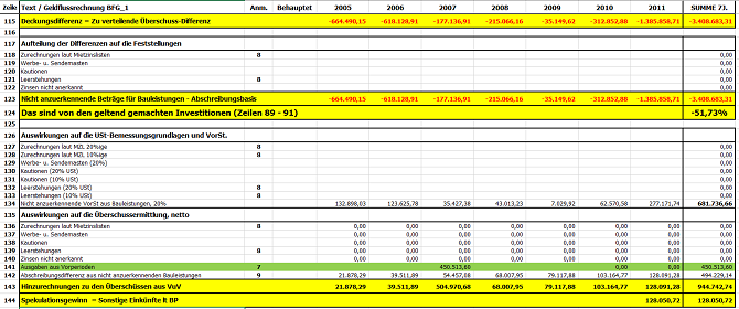 Der gedruckten Ausfertigung dieser Entscheidung sind zur besseren Lesbarkeit die Geldflussrechnung der steuerlichen Vertretung der Bf, die (letzte) Geldflussrechnung des Finanzamts und die Geldflussrechnung des BFG, die die Verteilung der Feststellungen auf die einzelnen Bemessungsgrundlagen enthält, im Format A3 beigeschlossen.