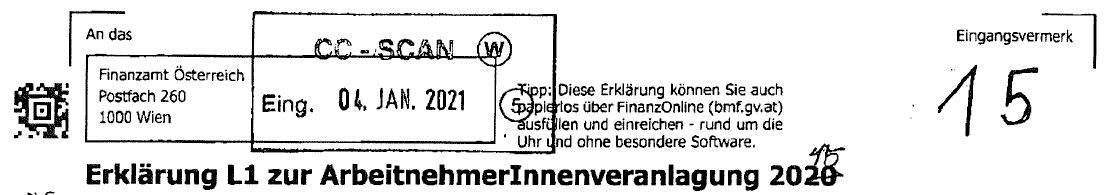 Die Erklärung L1 zur ArbeitnehmerInnenveranlagung 2015 (Antrag 2020 wurde auf 2015 korrigiert) trägt den Eingangsvermerk CC - Scan Eing. 04. Jan. 2021. Eine telefonische Rückfrage bei der Scanstraße hat ergeben, dass ein Postaufgabekuvert nicht bzw. nicht mehr verfügbar ist, da die Fristenthematik durch die Formularkorrektur von 2020 auf 2015 vom Bearbeiter in der Scanstraße nicht erkannt wurde. D.h. es wurde das Formular 2020 für das Jahr 2015 verwendet.