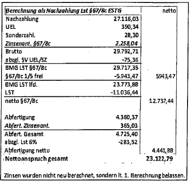 Darin sei über die Gesamtforderung des Urteils von 31.895,04 € (27.116,03 € + 4.779,01 €) samt 2.623,07 € zugesprochener Zinsen (diese wären zu diesem Zeitpunkt wie sich später noch herausstellte zu hoch berechnet gewesen) entsprechend dem § 67 Abs. 3 bzw. Abs. 8 lit. c EStG 88 abgerechnet worden.