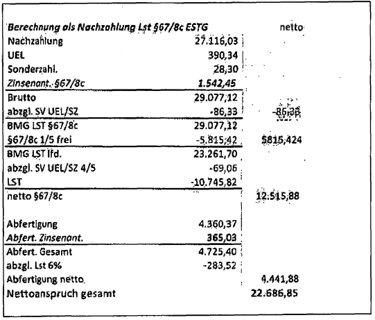 welches uns leider erst im März 2015 zugestellt wurde, Recht bekommen. Herrn A wurde darin nebst dem einbehaltenen und bereits besteuerten Betrag von 27.116,03 € auch Zinsen, geringfügig höhere Urlaubsersatzleistung und geringfügig höhere Sonderzahlungen, sowie eine Restabfertigung zugesprochen.