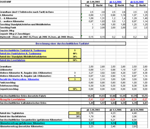 Eine durchschnittliche Taxifahrt in Wien beträgt lt. Taxiinnung 5 Kilometer. Anhand des Taxitarifes wurde der durchschnittliche Erlös pro besetzter Fahrt berechnet. Anschließend wurden 50% für Leerfahrten in Abzug gebracht. Gerechnet auf die angenommenen 5 Kilometer pro Fahrt erhält man einen durchschnittlichen kalkulatorischen Erlös pro Kilometer (nach Abzug der Leerfahrten).
