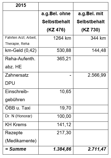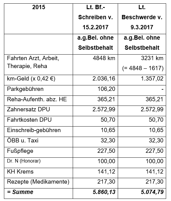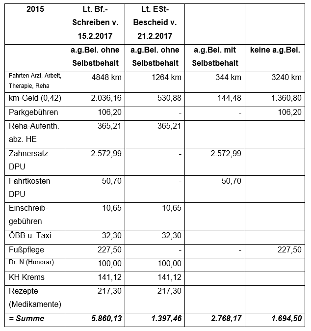 Nach Vorhalt des Finanzamtes vom 7. Februar 2017 zu den erklärten außergewöhnlichen Belastungen (ergänzend wurden noch Krankenhauskosten Krems i.H.v. 141,12 € geltend gemacht, insgesamt somit 5.860,13 € ohne Selbstbehalt), wurden im Einkommensteuerbescheid 2015 vom 21. Februar 2017 die außergewöhnlichen Belastungen vom Finanzamt wie folgt steuerlich berücksichtigt