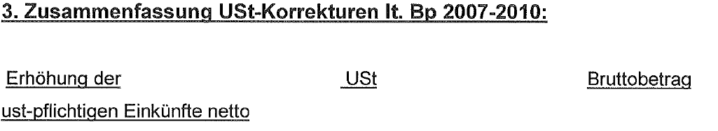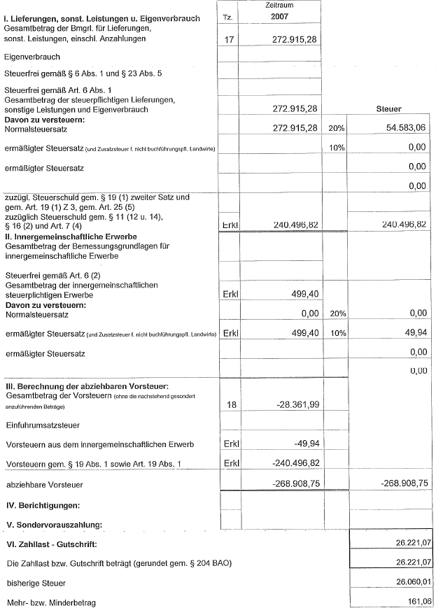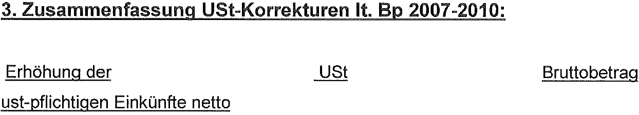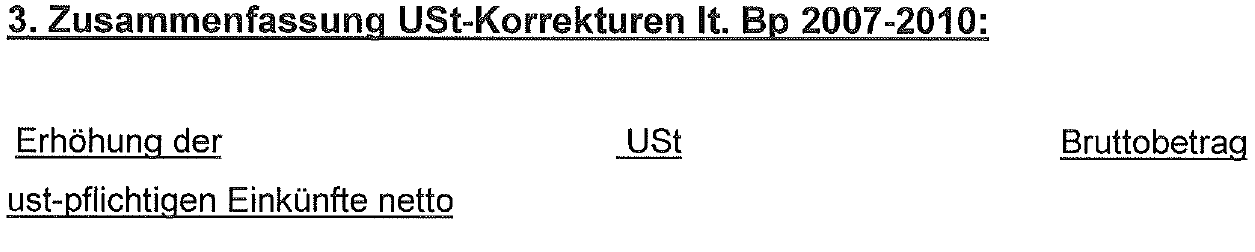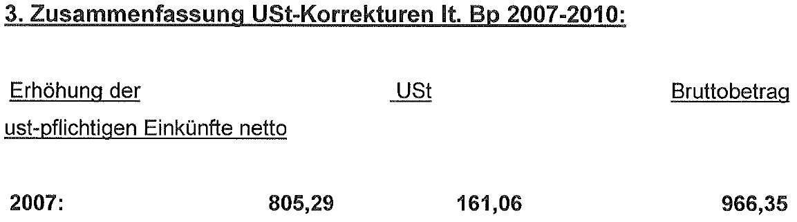 Im Zuge der Prüfung ist für 2007 eine korrigierte Umsatzsteuererklärung abgegeben worden. [Anm.: Diese ist aber im weiteren USt-Verfahren nicht berücksichtigt worden.]