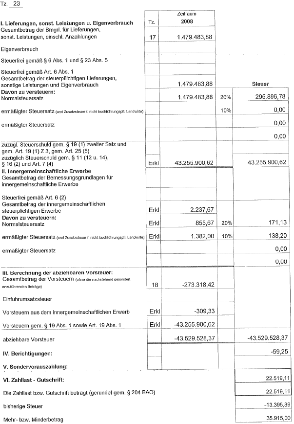 In der Tz 23 wird die Umsatzsteuer für 2008 mit der vorgenannten Änderung dargestellt: