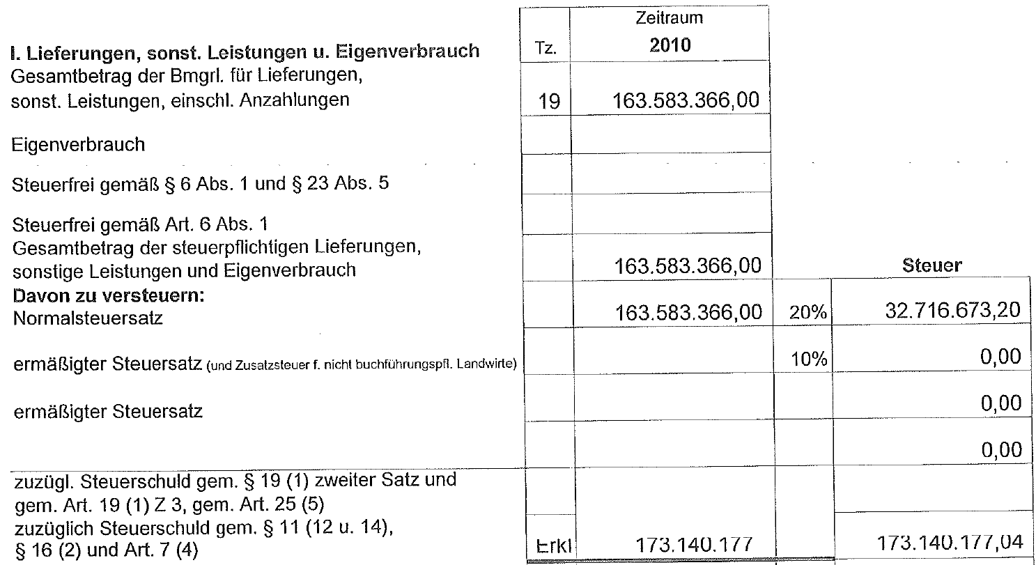 Die berichtigte USt-Erklärung für 2007 (auf Formular U 1; BFG-Akt Bl. I/159 f.) enthält gegenüber der am 25. Mai 2009 elektronisch eingebrachten Erklärung folgende Abweichungen: Bei den Kennzahlen 057 ("Steuerschuld gemäß § 19 Abs. 1 zweiter Satz, § 19 Abs. 1c, Abs. 1d sowie gemäß Art. 25 Abs. 5") und 066 ("Vorsteuern betreffend die Steuerschuld gemäß § 19 Abs. 1 zweiter Satz, § 19 Abs. 1c, Abs. 1d sowie gemäß Art. 25 Abs. 5") ist ein Betrag von jeweils 409.092,21 € angegeben. Es handelt sich um den Übergang der Steuerschuld vom leistenden ausländischen Unternehmer auf die Bf.