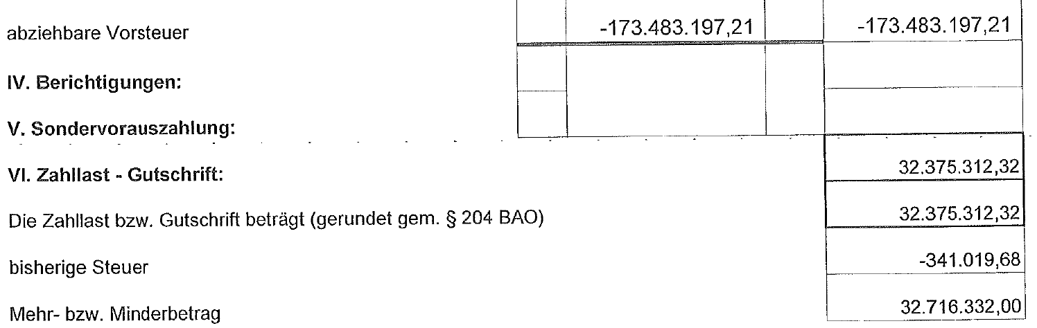 Die Berechnung der Abgabennachforderung nach dem Spruch des Bescheides basierte auf der Gegenüberstellung von einerseits Zahllast (=festgesetzte Umsatzsteuer) iHv 11.722.201,36 € und andererseits der bisher vorgeschriebenen Umsatzsteuer, d.h. hier den bisher für Jänner bis September 2009 verbuchten Vorsteuerüberschüssen im Ausmaß von -75.382,76 € (Negativbeträge auf dem Steuerkonto sind zugunsten des Steuerpflichtigen). Dieser verbuchte Betrag enthält nicht die UVA 4/2009, welche aus unerfindlichen Gründen nicht verbucht worden ist. Wäre die UVA 4/2009 mit ihren -12.117,48 € (Vorsteuerüberschuss) verbucht worden, so wäre für Jänner bis September 2009 insgesamt -87.500,24 € verbucht gewesen. Die Berechnung der Nachforderung hätte dann 11.722.201,36 -(-87.500,24) = 11.809.701,60 ergeben.