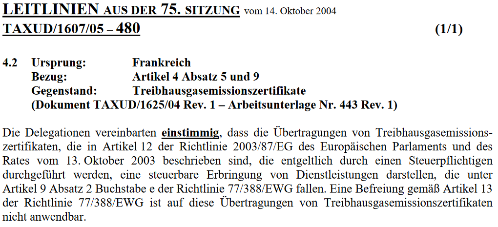 Es handelt sich bei einem derartigen Treibhausgas-Emissionszertifikat (CO2-Emissionszertifikat) um das Recht, die Umwelt mit einer Tonne CO2 (Kohlenstoffdioxid) zu belasten. Bezeichnung der hauptsächlich gehandelten Treibhausgaszertifikate auf Englisch: EU Allowance, abgekürzt EUA. Daneben gibt es die CERs (Certified Emission Reduction).