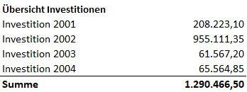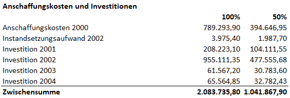 In den Jahren 2001 bis 2004 wurden von der Miteigentümerschaft darüber hinaus folgende Investitionen von in Summe EUR 1.290.466,50 getätigt:
