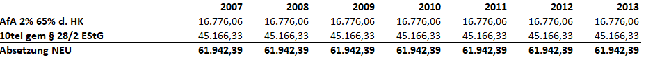 Der verbleibende Herstellungsaufwand (65%) war als Absetzung für Abnutzung über die Nutzungsdauer zu verteilen und iHv 2% absetzbar. Die AfA wurde mit EUR 16.776,06 festgesetzt.