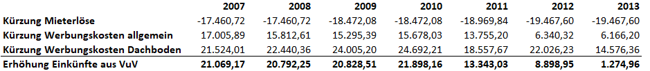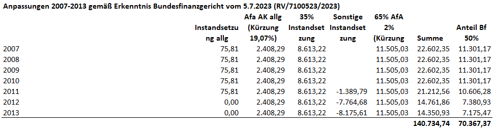 Laut den Feststellungen des Bundesfinanzgerichts im Erkenntnis vom 5.7.2023, RV/7100523/2023 hat das nicht anerkannte Mietverhältnis zwischen dem Beschwerdeführer und der Miteigentümerschaft jedenfalls ab dem Jahr 2003 bestanden. Daher sind auch in diesem Zusammenhang jene Werbungskosten mittels Zuschlägen im Jahr 2007 zu korrigieren, die eine Auswirkung auf den richtigen Totalgewinn haben. Im vorliegenden Fall betrifft das die folgenden Werbungskosten, die bereits im Sachverhaltsteil festgestellt wurden: