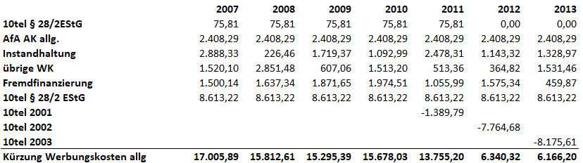 Die Werbungskosten allgemein wurden vom Bundesfinanzgericht im Flächenverhältnis der Wohnung zur Gesamtfläche des Hauses gekürzt. Da die Wohnung 19,07% der Gesamtfläche des Hauses betrug, wurden die Werbungskosten mit diesem Faktor gekürzt. Die Kürzung der Werbungskosten setzt sich wie folgt zusammen: