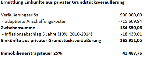 Die Einkünfte aus privater Grundstücksveräußerung waren daher nach der Regelung des § 30 Abs 3 EStG zu ermitteln. Die Immobilienertragsteuer beträgt daher EUR 41.487,76. Die Berechnung der Immobilienertragsteuer wird in der nachstehenden Berechnung dargestellt. Da im Jahr 2014 der damals geltende Inflationsabschlag zusteht, wurde dieser bei der Berechnung zugunsten des Steuerpflichtigen amtswegig berücksichtigt.