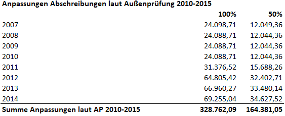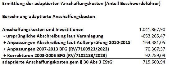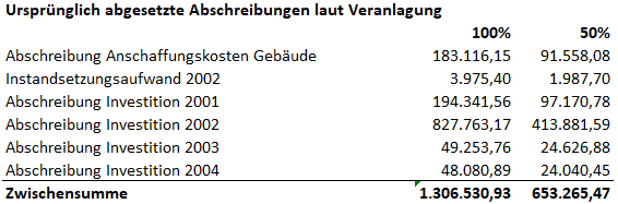 Im Rahmen der Außenprüfung für die Jahre 2007 bis 2013 wurde die beschleunigte Geltendmachung der Herstellungskosten nicht anerkannt. Es wurden 35% der Gesamtinvestition als Instandssetzungsaufwendungen qualifiziert, die über 10 Jahre verteilt absetzbar waren. Die Absetzung für Instandsetzung wurde mit jährlich EUR 45.166,33 festgesetzt.
