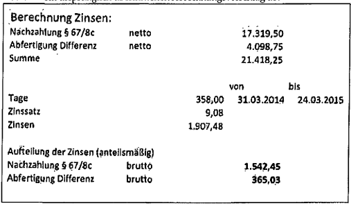 Allerdings wurden Hrn. A auch Zinsen in Höhe von 1.542,45 € zugesprochen. Die Bf hat zunächst eine höhere Summe, 32.054,41 € überwiesen, jedoch von Hrn. A wieder 8.931,62 € auf Grund von Falschberechnungen rückerstattet erhalten.