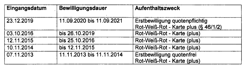Das Amt der Wiener Landesregierung, Magistratsabteilung 35, Einwanderung und Staatsbürgerschaft, bestätigte am 17.5.2021 folgende an ***5*** ***9*** erteilte Aufenthaltstitel: