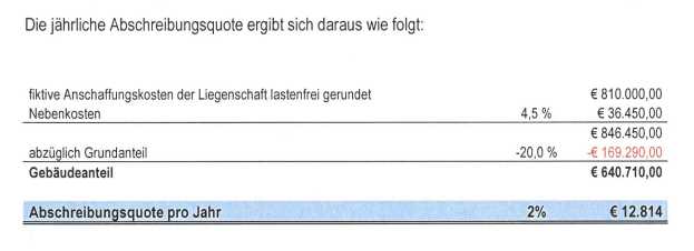 Im September 2010 legte die Beschwerdeführerin ein Sachverständigengutachten vor, aus dem sich ein jährlicher Abschreibungsbetrag in der Höhe von 12.814 € ergab: