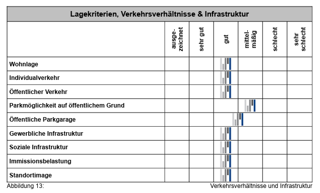 In diesem Zusammenhang sei noch auf die Abbildung 13 auf Seite 20 des Gutachtens vom 09.05.2023 verwiesen, aus der hervorgeht, dass die "Einschätzung der Lagekriterien, Verkehrsverhältnisse und der Infrastruktur" bezüglich der Kriterien "Wohnlage", "Individualverkehr", "Öffentlicher Verkehr", "Gewerbliche Infrastruktur", "Soziale Infrastruktur", "Immissionsbelastung" und "Standortimage" nicht von ausgezeichnet und auch nicht von sehr gut, sondern von gut ausgeht und das Kriterium "Parkplatzmöglichkeit auf öffentlichem Grund" mit mittelmäßig bewertet wird: