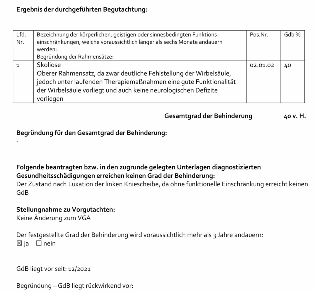 siehe auch VGA vom 09.08.2022 Diagnose Skoliose 40%
