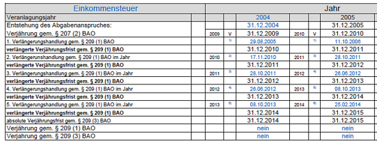 Sehr geehrte Damen und Herren, in Bezug auf die neuerliche Festsetzung der Einkommensteuer 2004 (letzter Bescheid vom 18. Dezember 2006) wenden wir gemäß § 207 Abs. 2 BAO den Tatbestand der Verjährung ein. Mit der Bitte um Kenntnisnahme verbleiben wir mit freundlichen Grüßen Mag. Beatrix G*****