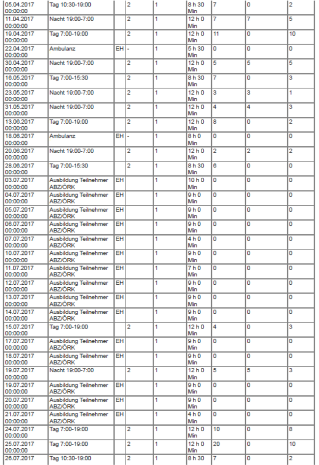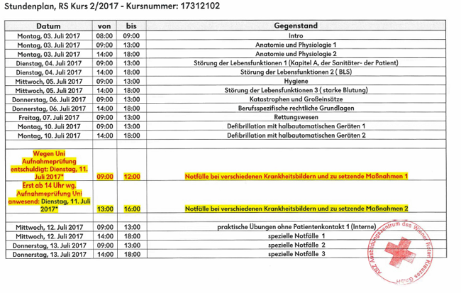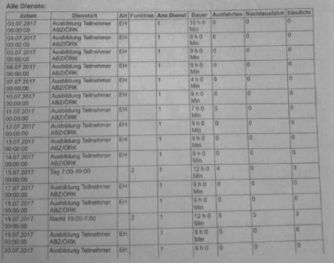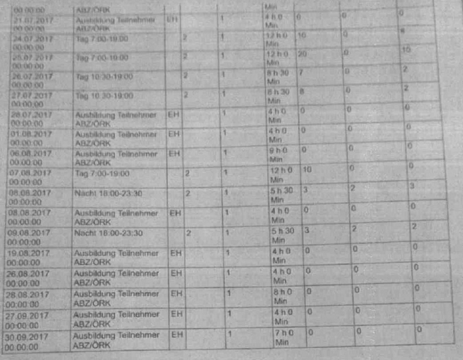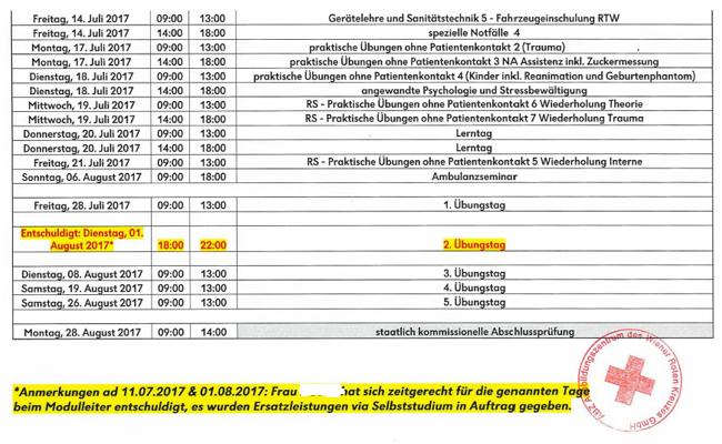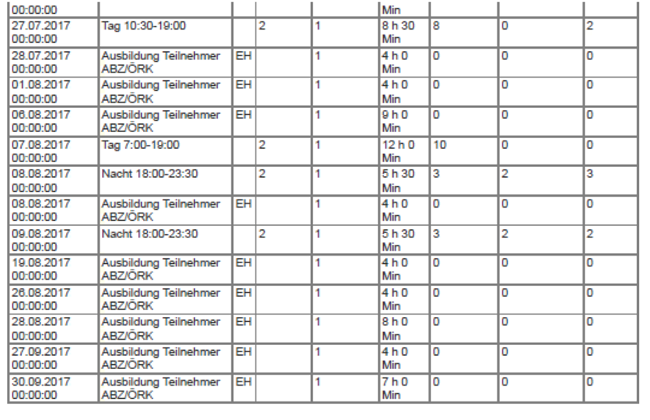 In den Monaten Juli, August und September 2017 wurden insgesamt 260 Stunden theoretische Ausbildung und praktische Ausbildung absolviert (dazu kommen noch die hier nicht zu berücksichtigenden Ausbildungszeiten zwischen Februar und Juni 2017 während des Freiwilligen Sozialjahrs; insgesamt dauerte die Ausbildung 468 1/2 Stunden).