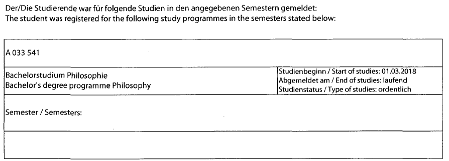 Sie legte die Studienzeitbestätigung Bachelorstudium Philosophie, Studienbeginn 01.03.2018 der Uni Wien bei.