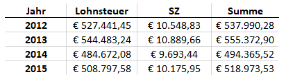 Infolge der Prüfung erließ das Finanzamt am 30.10.2018 jeweils für die Jahre 2012 bis 2015 Haftungsbescheide gemäß § 82 EStG betreffend Lohnsteuer, Abgabenbescheide für Dienstgeberbeitrag (DB) sowie Säumniszuschläge (SZ) für beide Abgaben. Die festgesetzten Mehrbeträge hinsichtlich Lohnsteuer setzen sich wie folgt zusammen: