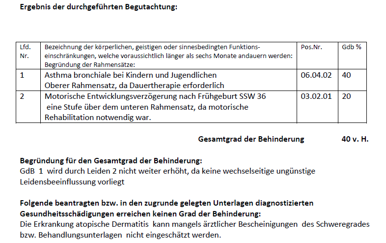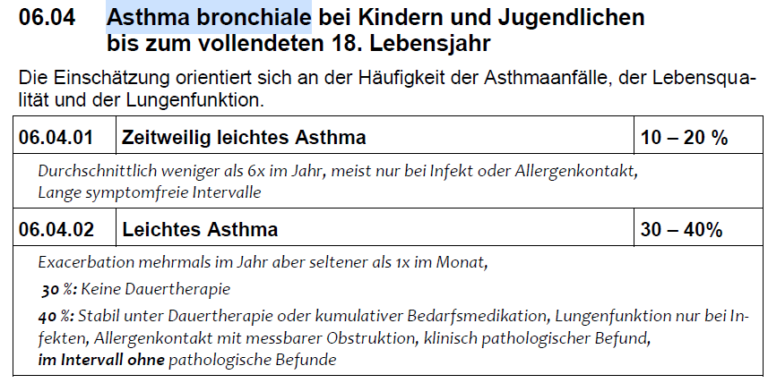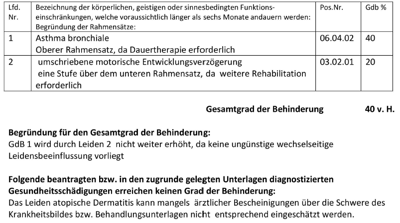 Die Erkrankung "Frühkindliches allergisches Asthma bronchiale mit atopischem Ekzem wurde unter die Richtsatzposition 06.04.02 mit einem Grad der Behinderung von 40% eingereiht.