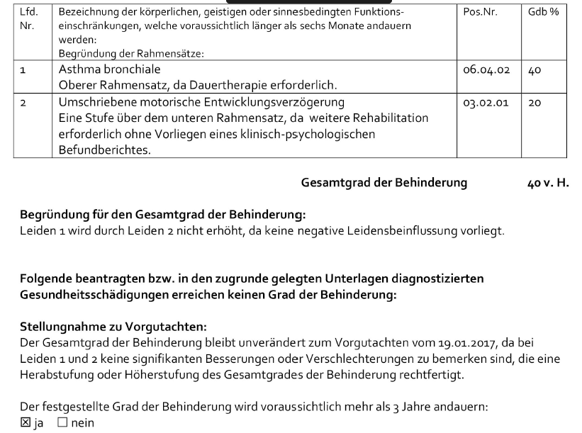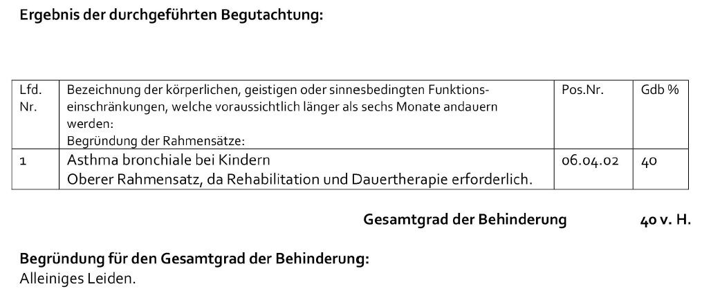 Die Erkrankung "Asthma bronchiale bei Kindern" wurde unter die Position 06.04.02 mit einem Grad der Behinderung von 40% eingereiht und der Gesamtgrad der Behinderung von 40% damit begründet, dass es sich bei der Erkrankung um das alleinige Leiden handle.
