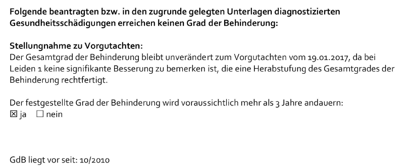 Der festgestellte Grad der Behinderung wird voraussichtlich mehr als 3 Jahre andauern: